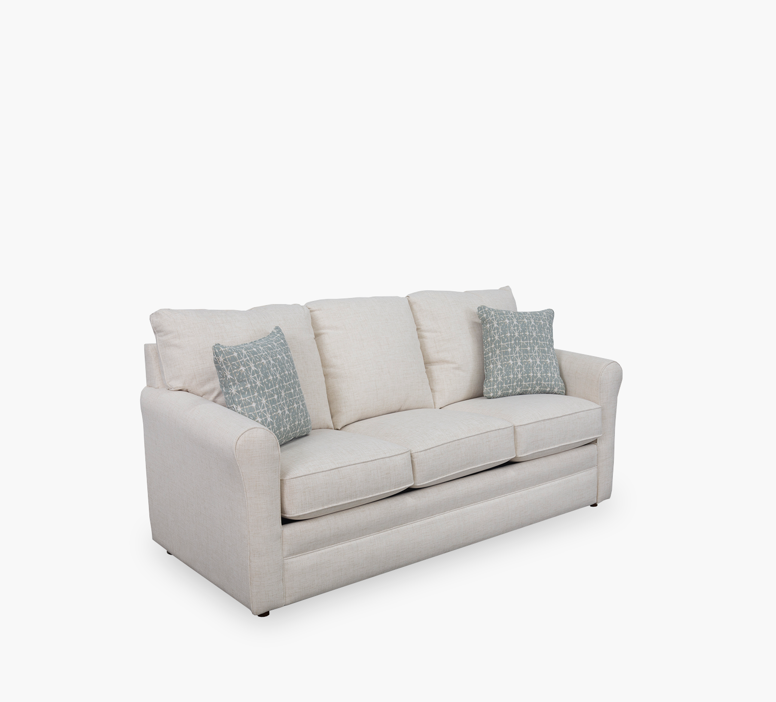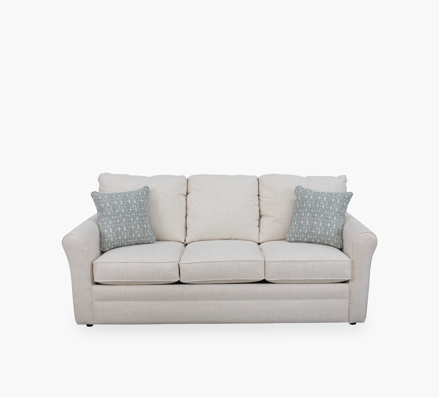 Three seat styling with semi-attached back pillows and box welted seat cushions and roll arms. Features and air mattress with a 6″ cushion of air over a 4″ innerspring coil base. Includes 2 correlate throw pillows.
